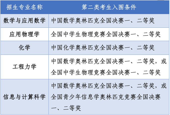 全國(guó)青少年學(xué)科奧林匹克競(jìng)賽(數(shù)學(xué)、物理、化學(xué)、信息學(xué))全國(guó)決賽中獲得一、二等獎(jiǎng)的考生。全國(guó)青少年學(xué)科奧林匹克競(jìng)賽獲獎(jiǎng)學(xué)生以全國(guó)青少年科技競(jìng)賽獲獎(jiǎng)名單公示網(wǎng)站(http://gs.cyscc.org/)公示的名單為準(zhǔn)。