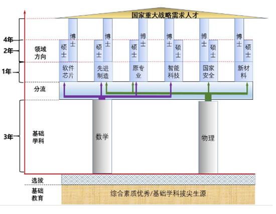 強基計劃遵循“先理后工”的培養(yǎng)思路,即:通過數(shù)學(xué)、物理基礎(chǔ)學(xué)科專業(yè)招生,采取“3+1+X”本碩博銜接培養(yǎng)模式。其中,“3”是指本科前三年主要以基礎(chǔ)學(xué)科專業(yè)課程為主,“1”是指本科第四年進入相關(guān)領(lǐng)域(如下圖)學(xué)習(xí),通過項目驅(qū)動完成專業(yè)基礎(chǔ)和選修課程;碩士、博士研究生階段可分流至相關(guān)領(lǐng)域的相應(yīng)專業(yè)進行學(xué)習(xí)研究工作,“X=2”是指本碩銜接,碩士階段2年,“X=4”是指本碩博銜接,碩博階段4年(具體畢業(yè)年限視研究進展和論文完成情況確定)。